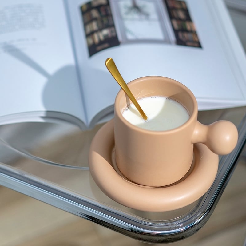 丸みを帯びた、変わった持ち方が楽しめる「ボール型取っ手マグ&ソーサー」。
