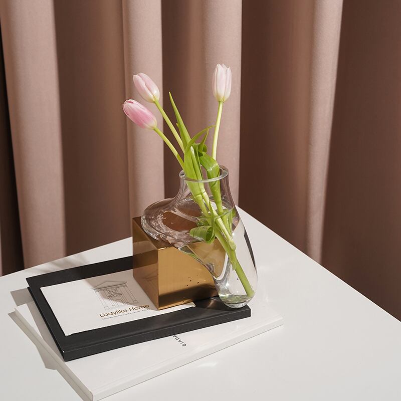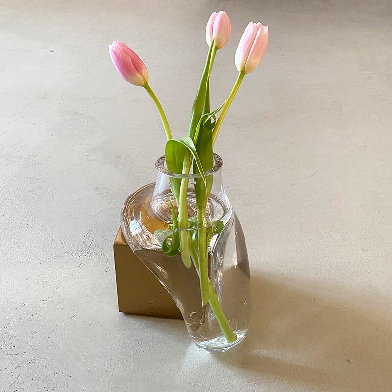 付属の長方形のオブジェに寄りかかるようなデザインが楽しめる「リーンフラワーベース」。
