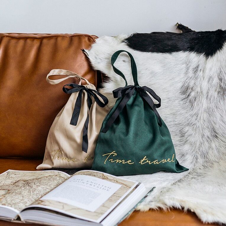 肌触りのいいベロア調巾着袋・両絞りタイプで、口の開け閉めがスムーズにお使いいただけます。