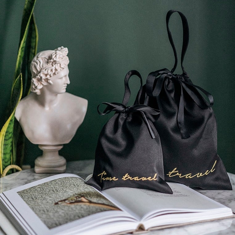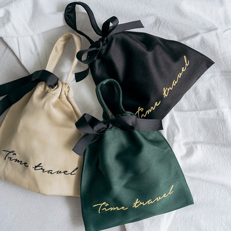 高級感のある金色の刺繍が特徴の「サテンポーチ」。