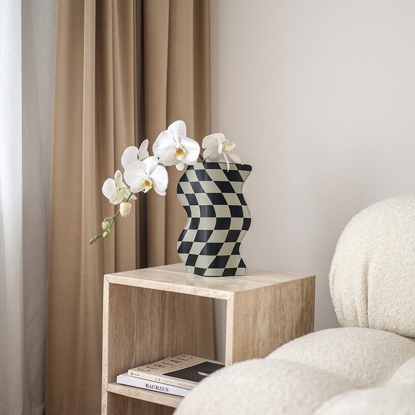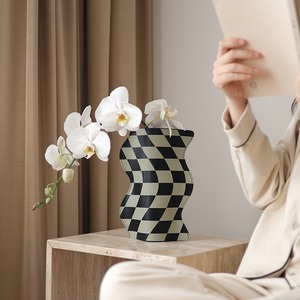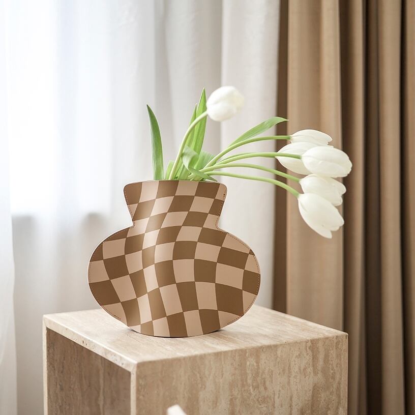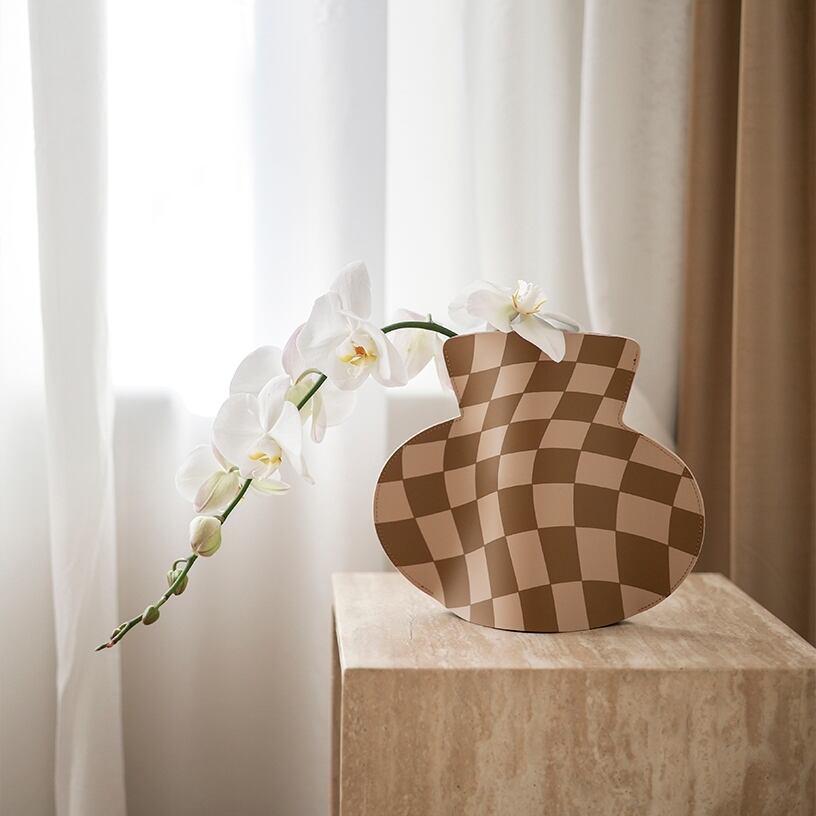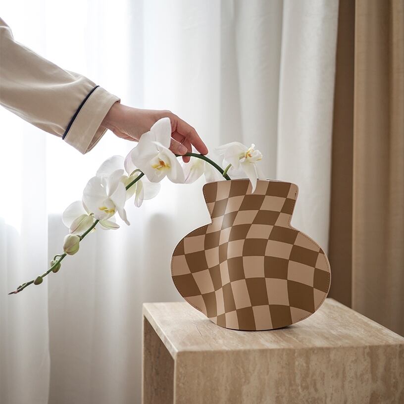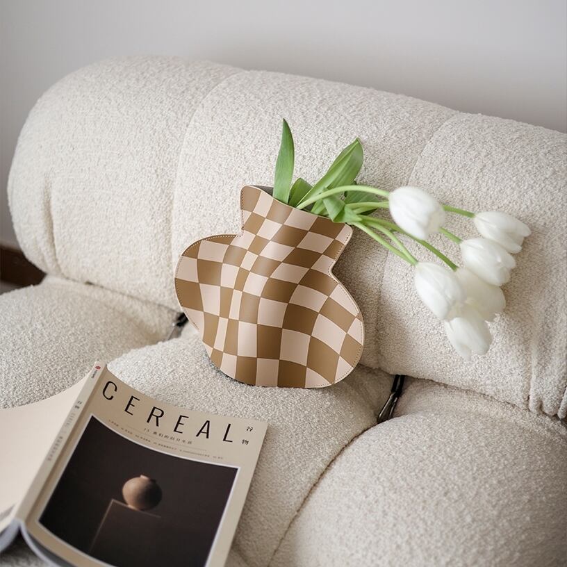 市松模様の存在感のある個性的なデザインがお洒落な「チェックレザーフラワーベース」。