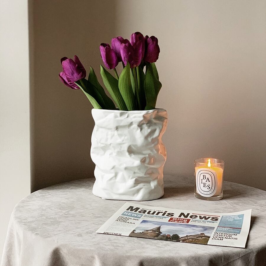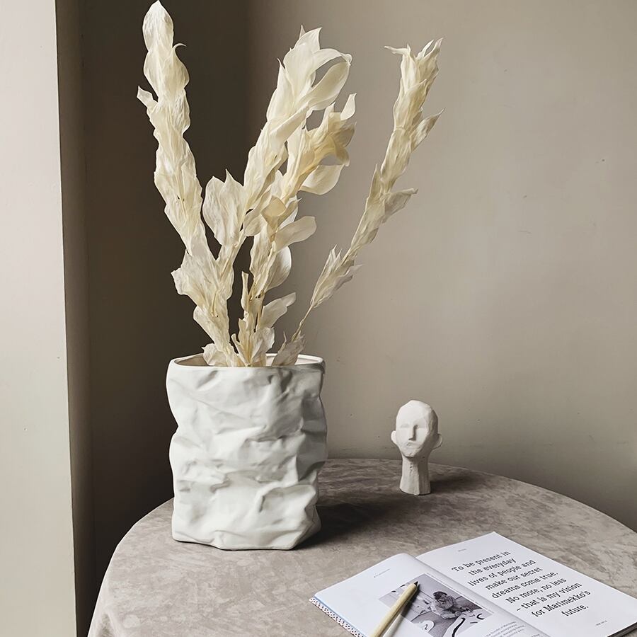 紙の自然な折り目やシワを繊細に型取った「Crumpled Vase」はテクスチャーから厚みまで